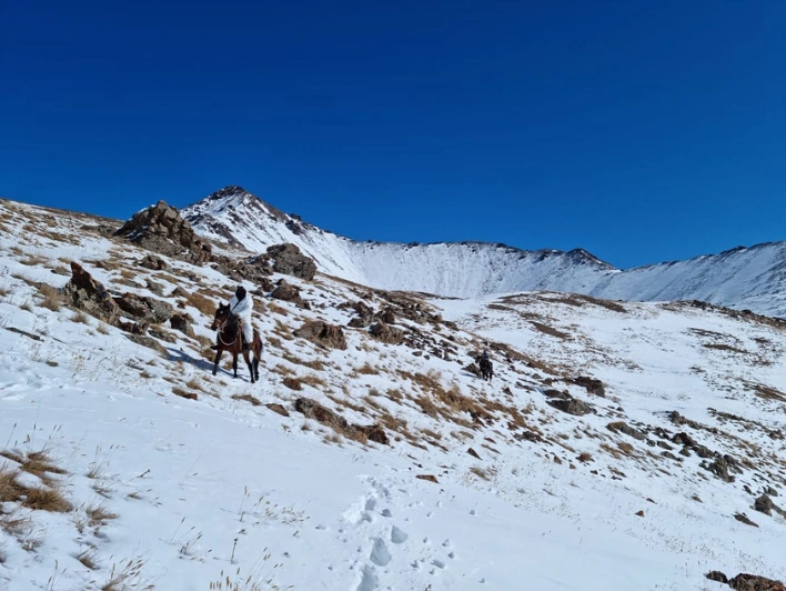 The hunt begins early each morning. We ride horses for 3 to 6 hours into the high country to reach hunting areas. If Marco Polo sheep herds are spread out, each hunter is taken to a different valley; if the animals are grouped in large numbers, we adapt the strategy to give everyone an equal chance. Every day is different, depending on weather, snow conditions, and even predator activity – wolves and sometimes snow leopards move through the same ranges.